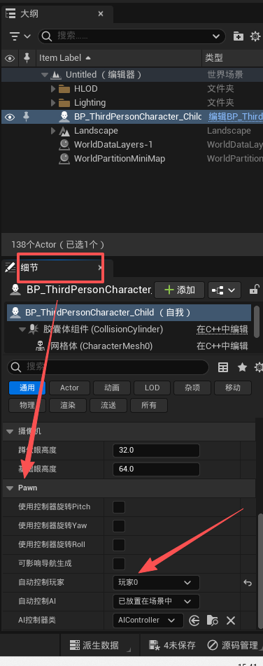 - 细节 -> pawn -> 自动控制玩家